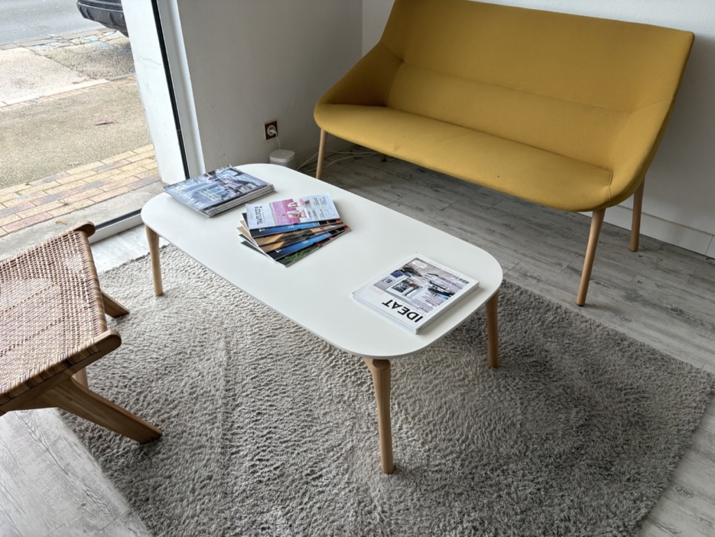 Une table basse, piètement bois, blanche