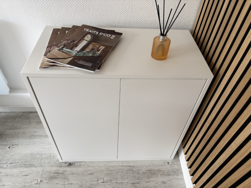 Une petite armoire basse, deux portes, stratifiée, blanche