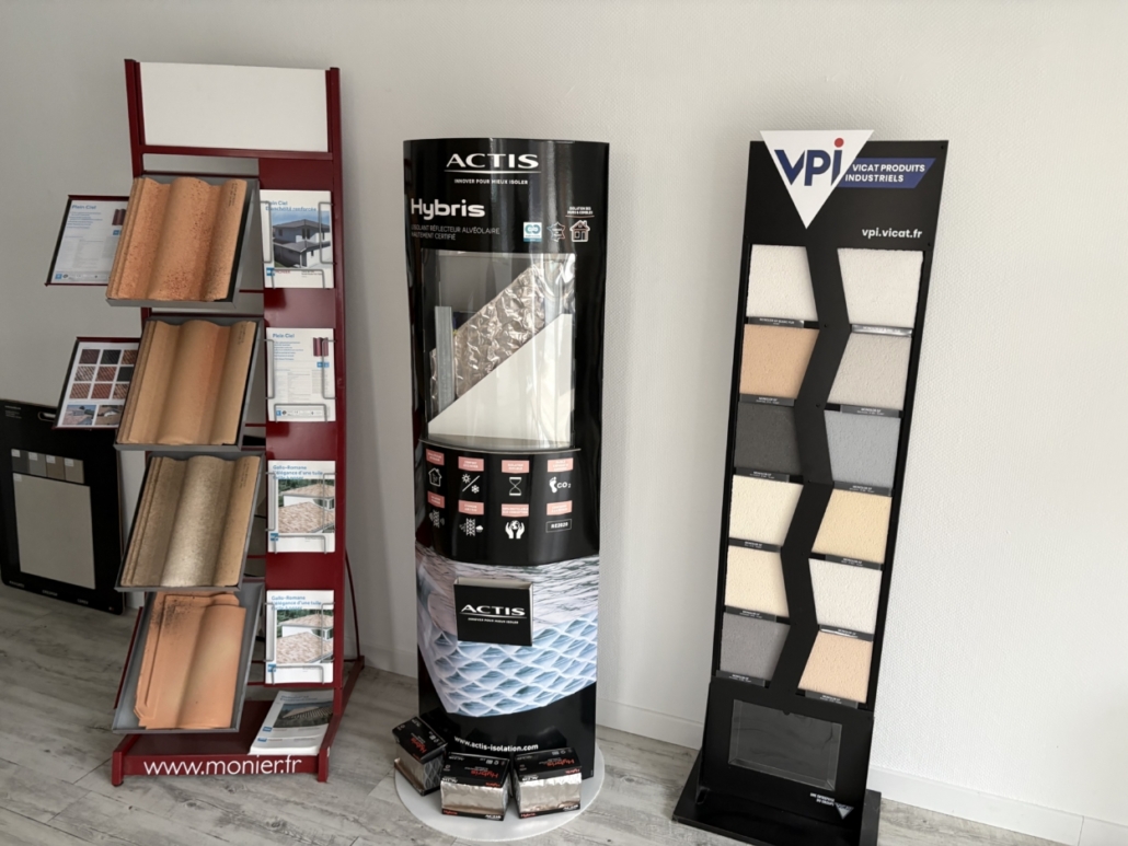 3 présentoirs de matériaux : tuiles, isolation et enduit