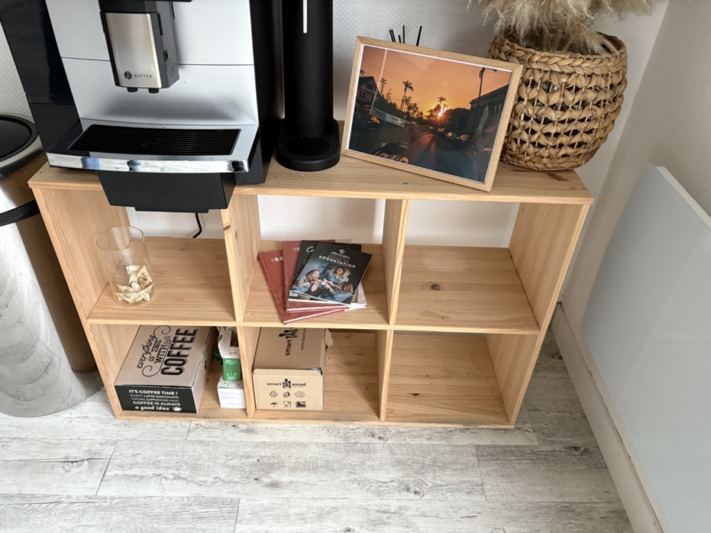 Une étagère bois, neuf cases.