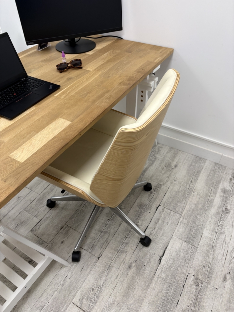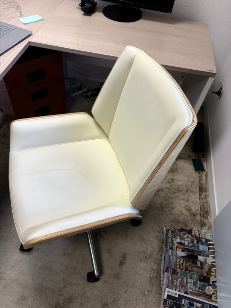 Un fauteuil de bureau sur roulettes, assise similicuir blanche, dosseret bois