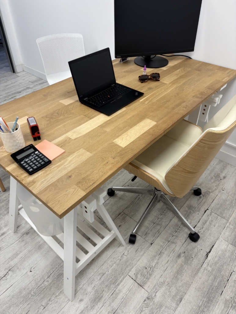 Un bureau plateau bois sur tréteaux blanc