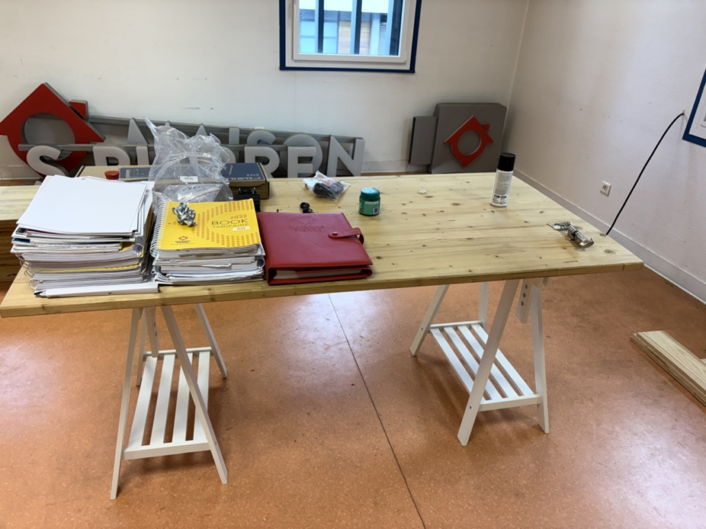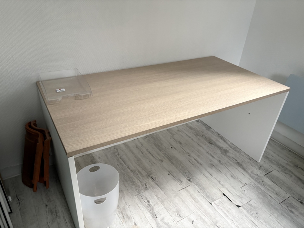 Un bureau, plateau rectangulaire bois sur tréteaux