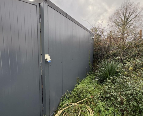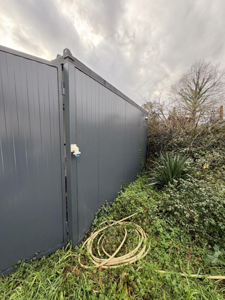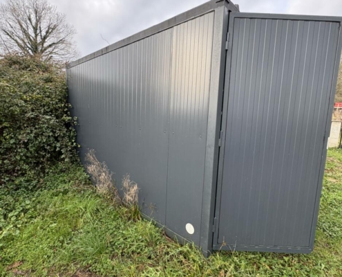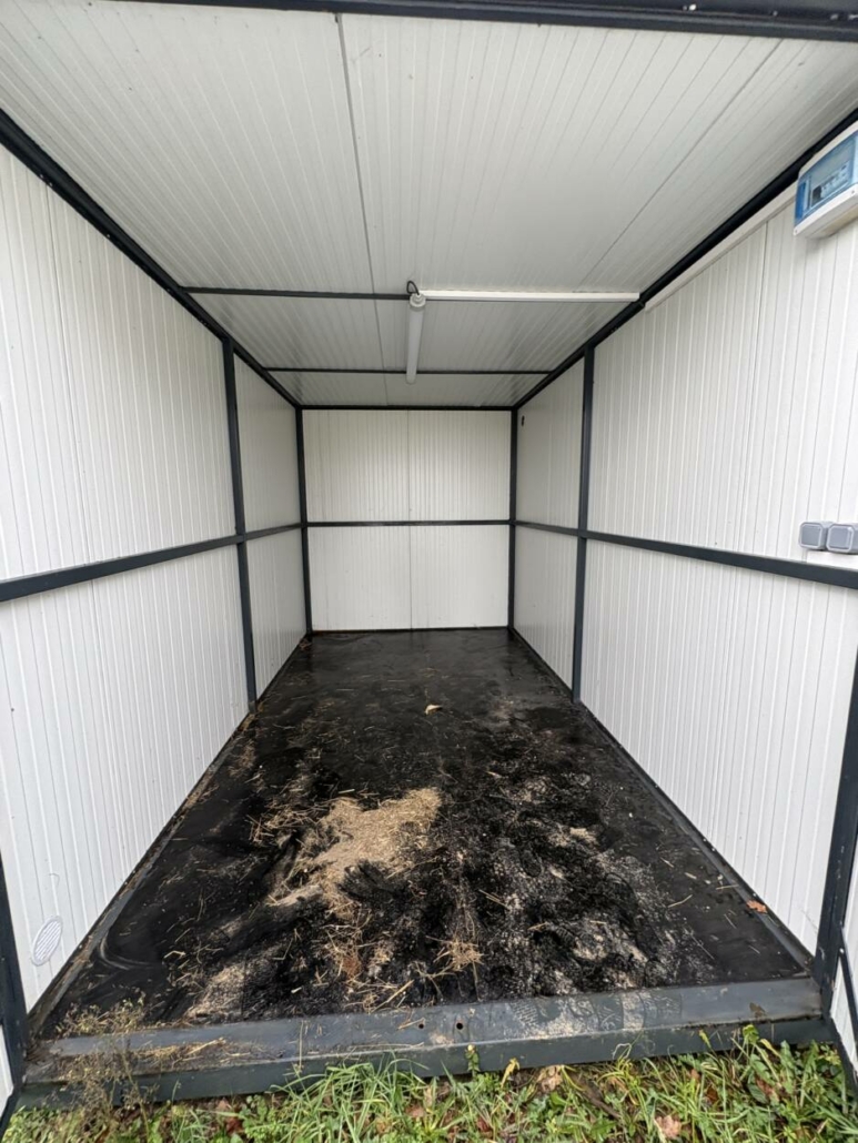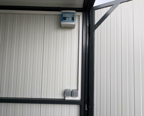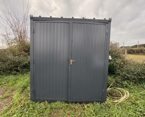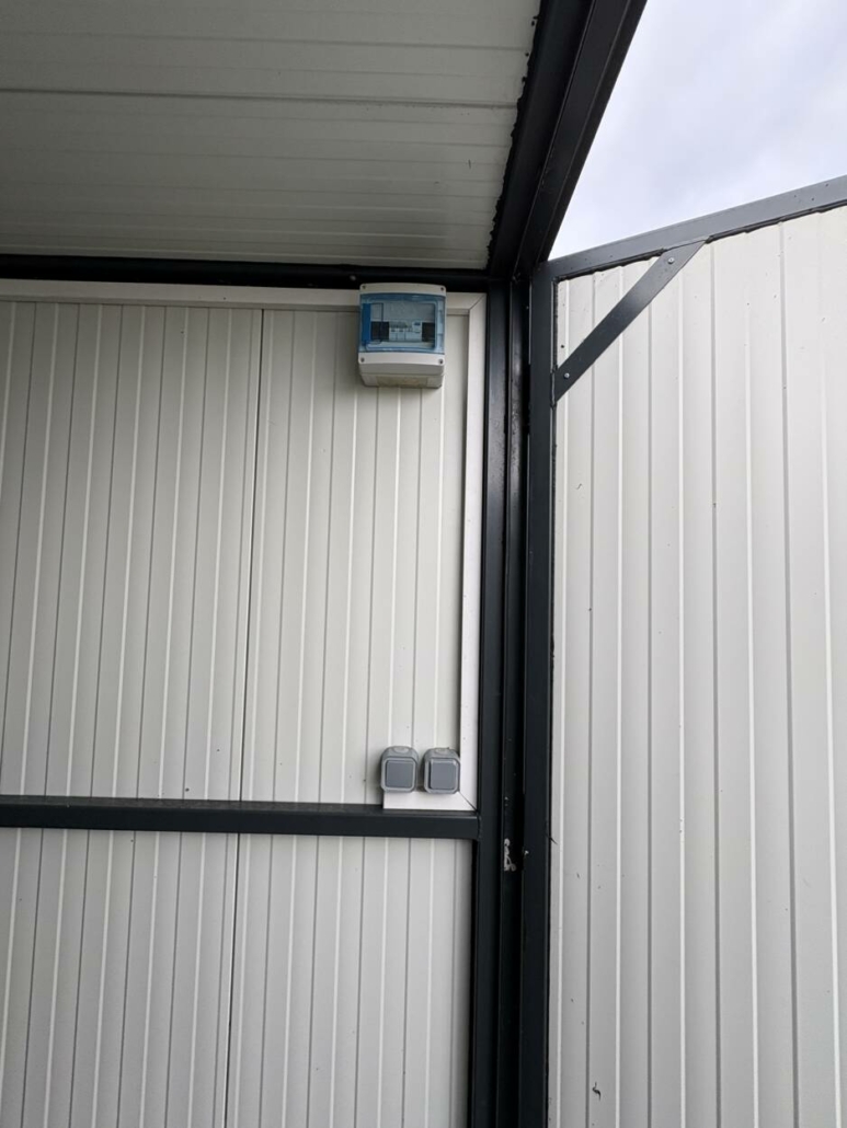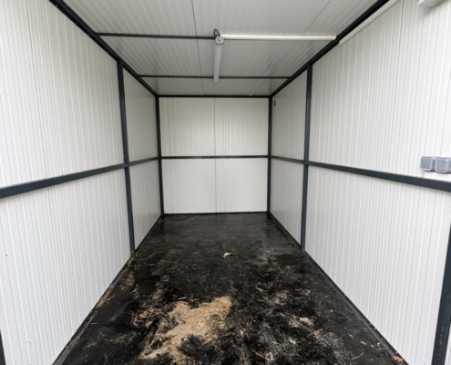 • Un box de stockage 2,5x4m de surface, isolation murs en panneaux sandwich de 40 mm, isolation plafond en panneau sandwich de 80 mm, sol en panneau filmé doublé sur ferraille pour protection, portes 2 vantaux avec serrure 3 points, appareillé électriquement lumière et prise), prise de transport sur toit.