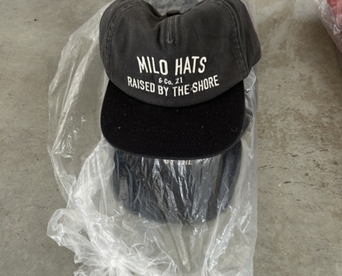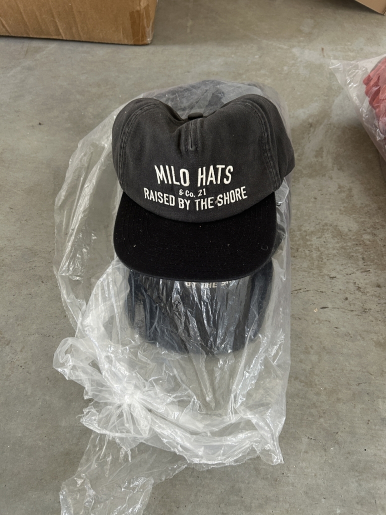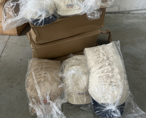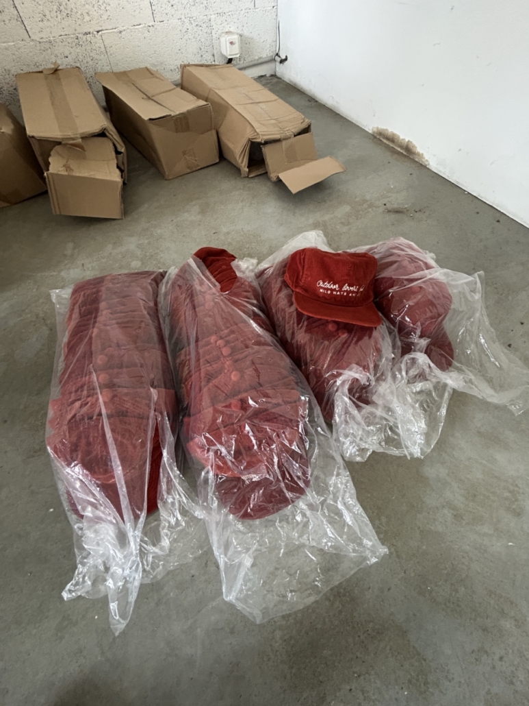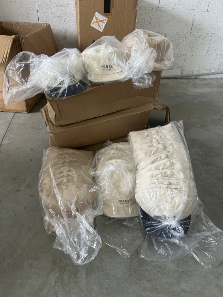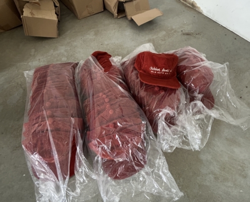 63 casquettes couleur rouge, 13 unités couleur gris foncé/noir, 213 unités coloris beige, différents modèles, matières et logos (Prix de Vente environ 36€ TTC ; Prix de fabrication 8€ HT)