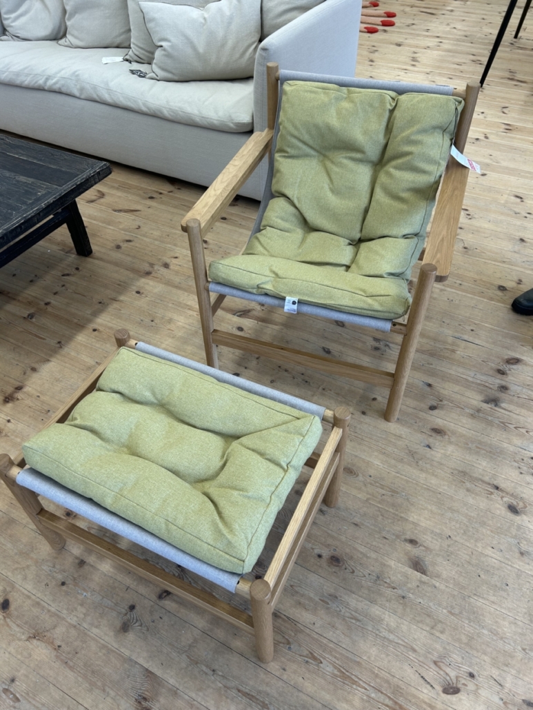 1 fauteuil accoudoirs bois, assise tissu, repose pieds assorti,